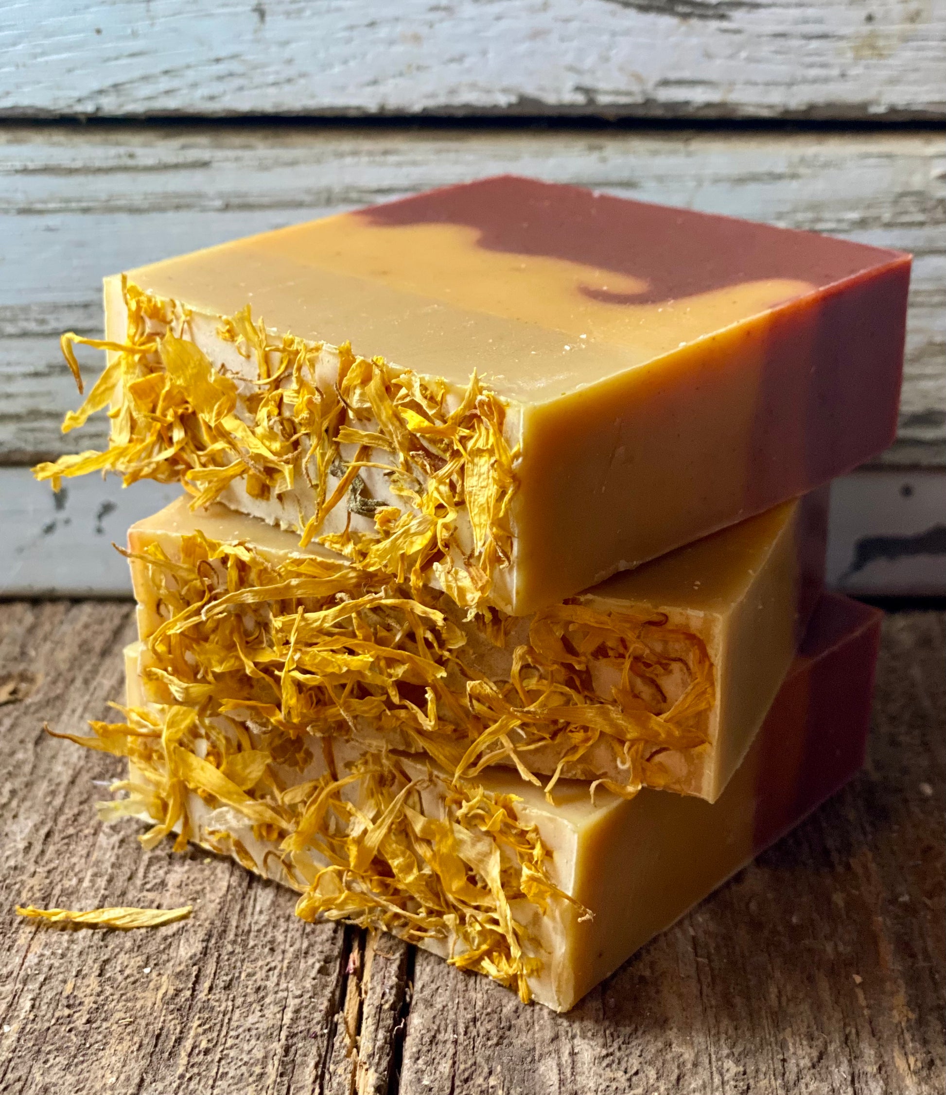 Ingredients - saponified (lard, coconut, olive, and castor oils), kaolin clay, rhubarb powder, turmeric, lemon peel, sweet orange essential oil, cinnamon essential oil, marigold -calendula petals