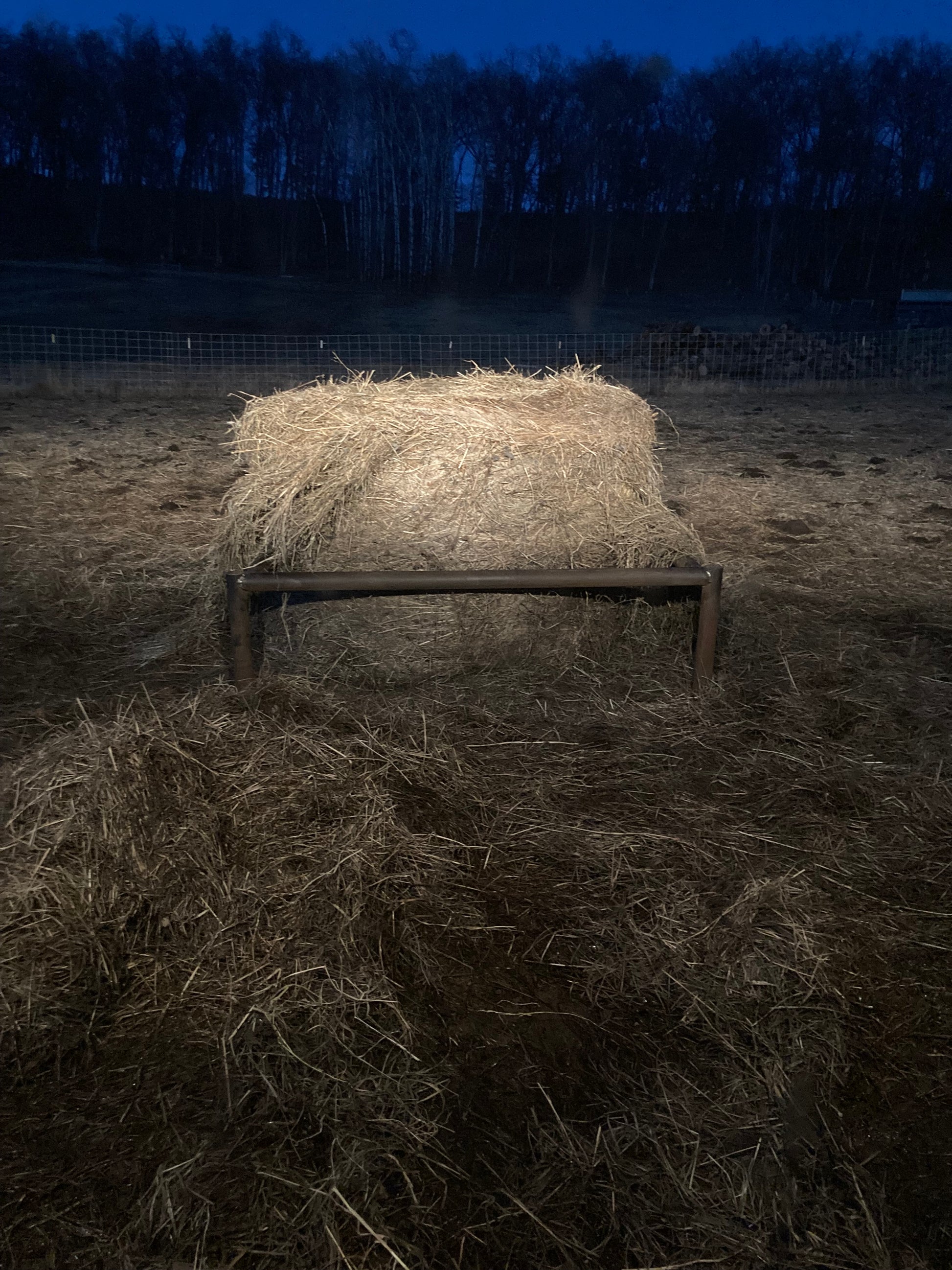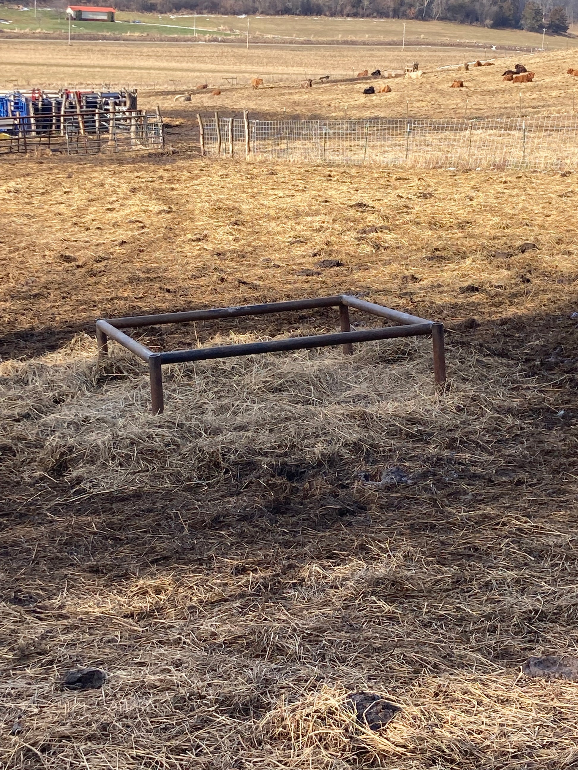 We have designed a feeder for horned cattle that can take all the abuse without failure. Made of 2 7/8 oilfield pipe, the feeder is heavy duty and able to withstand abuse. All connections are saddled and welded. Dimensions are 6ft by 6ft and 2ft tall. Weight approximately 200lbs. Designed to feed out 4x5 round bale.