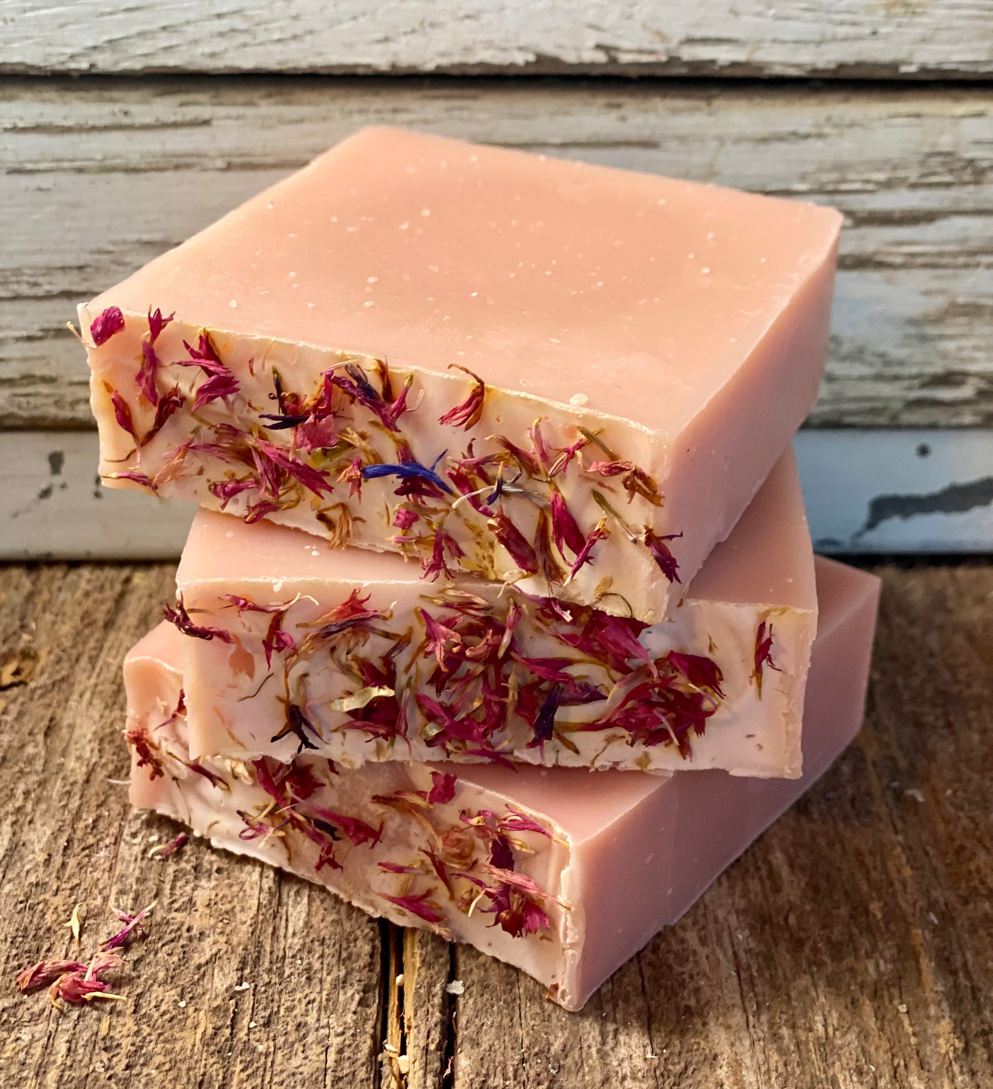 Ingredients - saponified (lard, coconut, olive, and castor oils), geranium essential oil, grapefruit essential oil, kaolin clay, rose clay, pink corn flowers